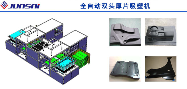 全自動(dòng)雙頭厚片吸塑機是由上海駿精賽自主研發(fā)的大型雙工位厚板真空吸塑設備,主要用于汽車(chē)內飾等大型板材厚吸塑件加工成型。這臺機器有兩個(gè)吸塑工位、兩個(gè)上料工位、一個(gè)加熱爐、兩種加熱模式:自動(dòng)上料和手動(dòng)上料。